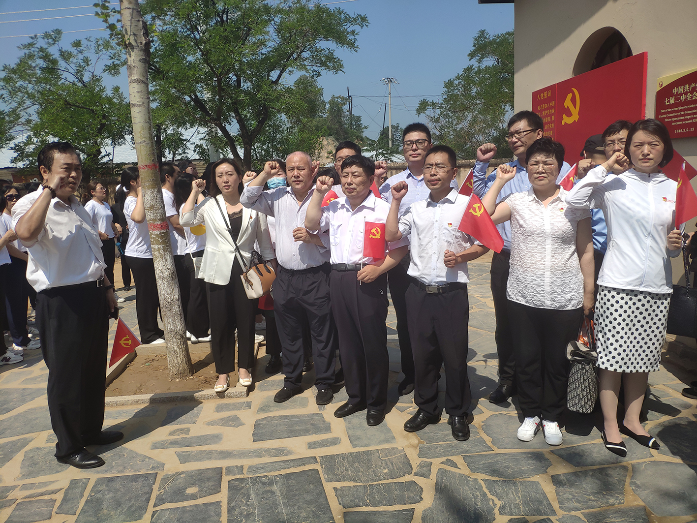 在集团党委委员杜家琳的带领下,大家在七届二中全会会址前庄严宣誓,面对鲜红的党旗,重温入党誓词。