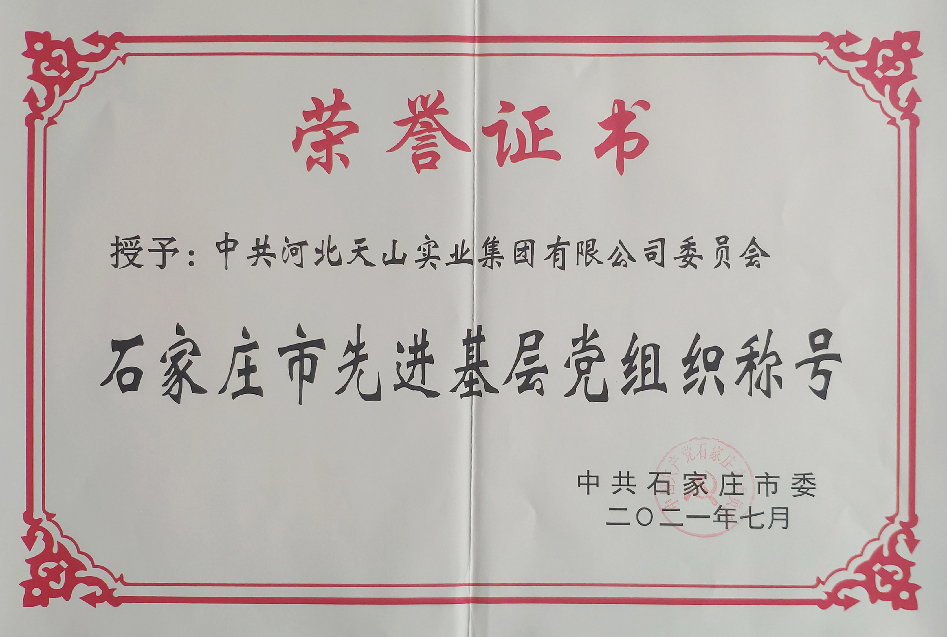 为隆重庆祝建党百年,表彰全市先进基层党组织,近日,天山集团党委荣获2021年石家庄市“先进基层党组织”称号,并颁授荣誉证书和奖牌。