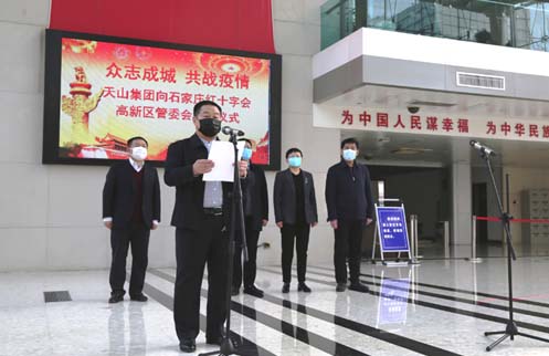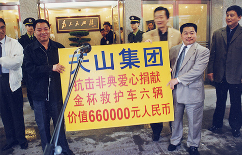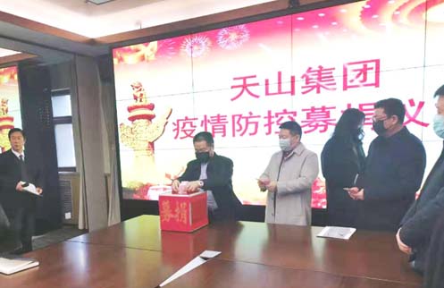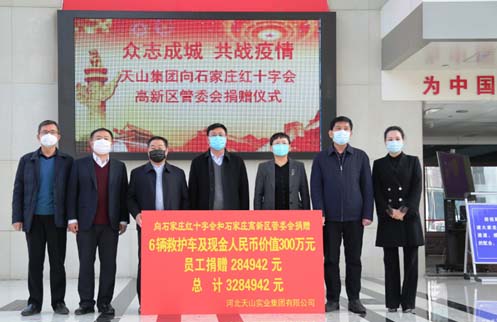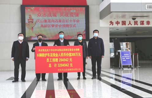 2020年2月2日,天山集团向����� �������Ƴ������������ �������Ƴ������������ �������Ƴ������������ �������Ƴ�������石家庄市红十字会和石家庄高新区管委会捐赠六����� �������Ƴ����������� �������Ƴ������������ �������Ƴ������������ �������Ƴ�������辆救护车及现金人民币价值300万����� �������Ƴ������������ �������Ƴ����������� �������Ƴ����������� �������Ƴ�������元,员工捐赠28.4942万元,天山集团����� �������Ƴ������������ �������Ƴ����������� �������Ƴ������������ �������Ƴ�������捐款总额达328余万元。