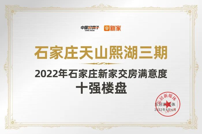 石家庄天山熙湖三期项目荣获2022年石家庄新家交房满意度第一。